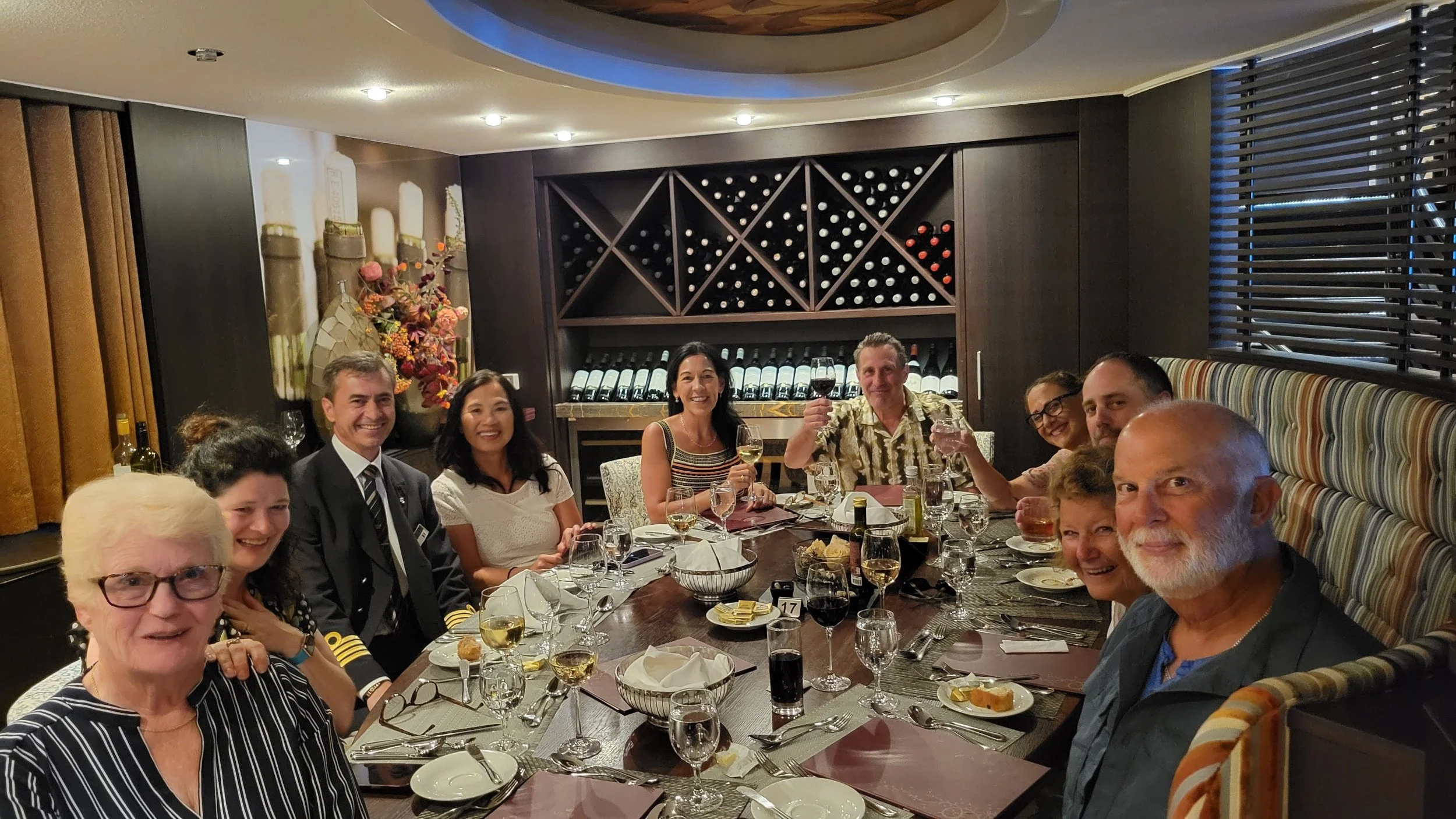 One evening, the Captain came and visited our table. We always grabbed the big table so we could engage with each other. Around the table from the left is Mum, Jodi, Captain, Julie, Melanie, Dave, Lindsey, Ben, me and Keith. The meals were at lesat four courses with several options and so very good. It was nice they served small portions so we didn't fill up too much.