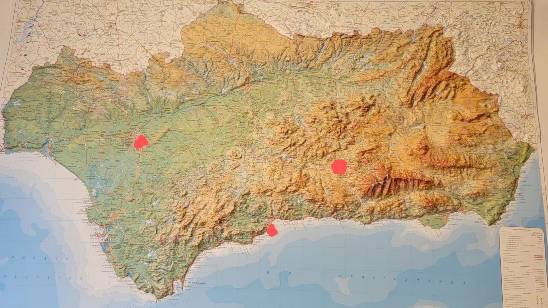 We left Torremolinos mid-morning, caught a train and 1.5 hours later, we were in Granada, located in the foothills of the Andalucia Region. Looking at this map, Torremolinos is the bottom red circle, by the sea. Granada is the circle on the right, in the mountains. Seville is in the flat lands on the left. Our trip from Granada to Seville will be by bus.