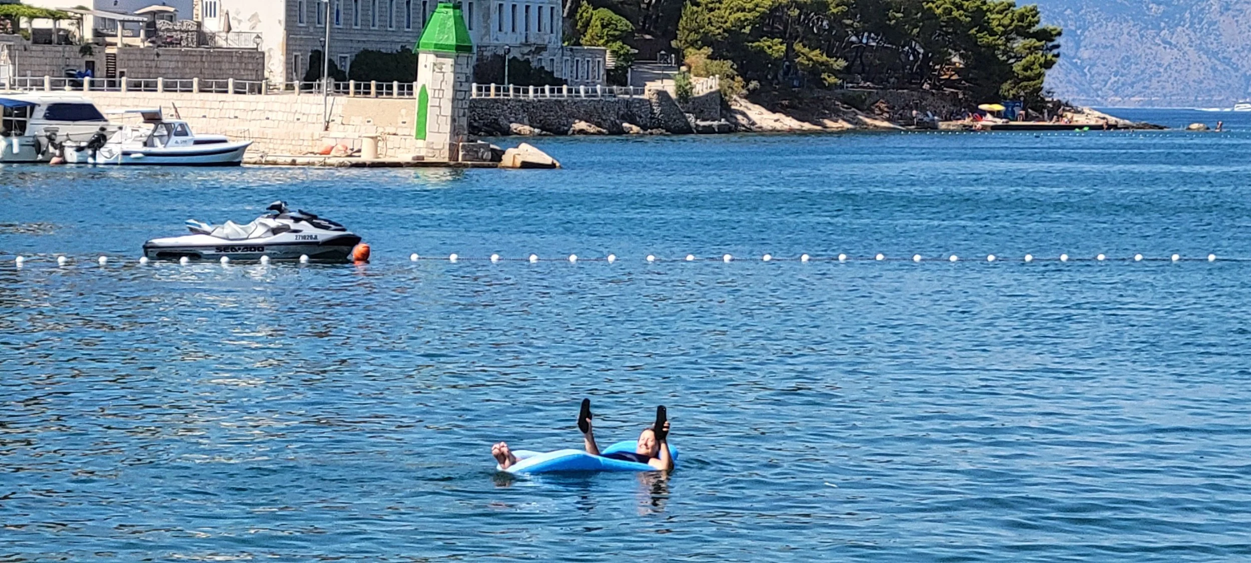 Jelsa was very quiet, so we bought a little raft and I went swimming at a little beach near the boat. Keith opted to stay dry and enjoy a beer in the shade. At 2:00 we headed to Hvar, a 30 minute drive to the west side of the island. We were a bit surprised, Hvar was not small. The bay was very large and full of cruise ships, charter boats, and pleasure crafts. This also meant there were lots of people everywhere, and did I say how hot it was.