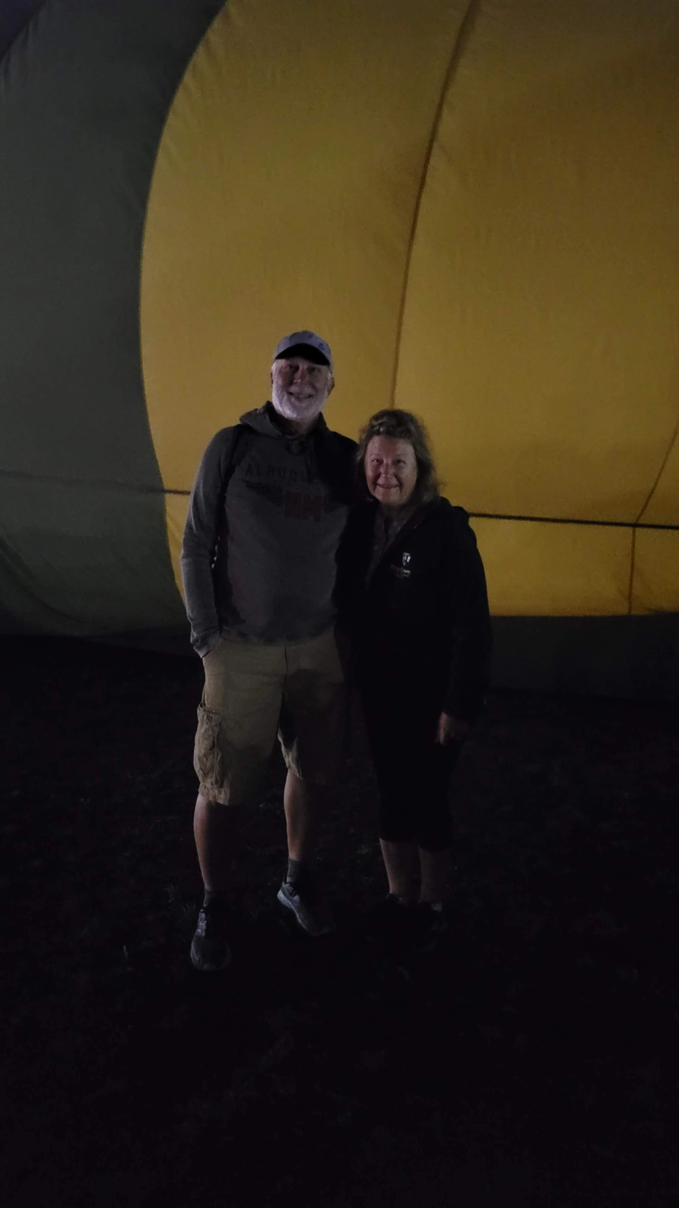Originally, we had only purchased tickets into the venue, but quickly learned you could also purchase tickets for balloon rides. Randy and Cyndi were with us but Cyndi wanted to stay on the ground. We got in line and put our names on the wait list, expecting to be too late. We were pleasantly surprised when our names were called. How fun was this going to be! We headed out to our respective balloons, Randy in one and Keith and I in another. But it wasn’t a sure thing yet. We had to wait for the ‘green light’ from the officials to launch. If it’s too windy, they can’t fly. If the wind is southerly in the upper jet stream, they can’t fly as it blows them into the local air traffic pattern.