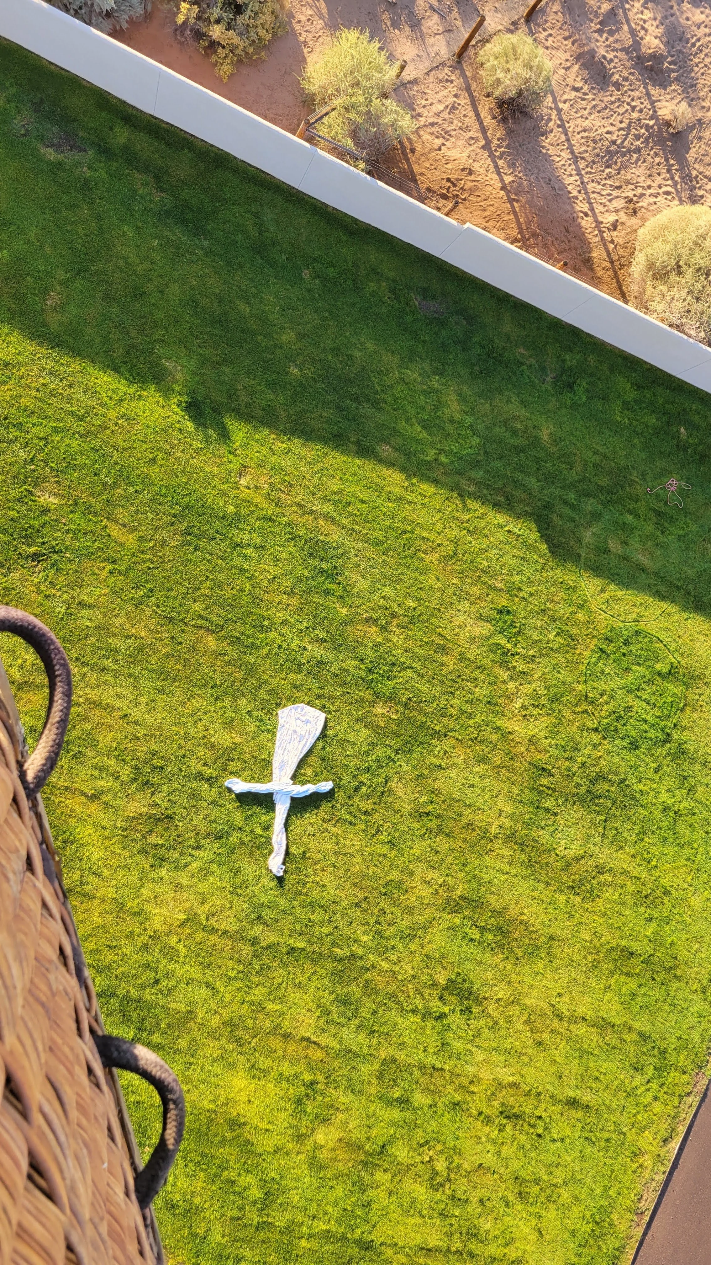 Everywhere we flew, we noticed random white X's on the ground, in cul-de-sacs, on streets, in fields, parking lots, etc. The X is an invitation for ballons to land and are usually made out of large strips of white tape that can be seen from the air. This one was in the back yard of a home as we were coming in to land. We were so close, we could talk to families as they came out to watch. This mom told us her kids really wanted a ballon to land in their backyard so they used sheets to make an X big enough to be seen. We all laughed and cheered them on, but of course, the space was just too small. Mom knew no one was going to land but we all encouraged the kids.