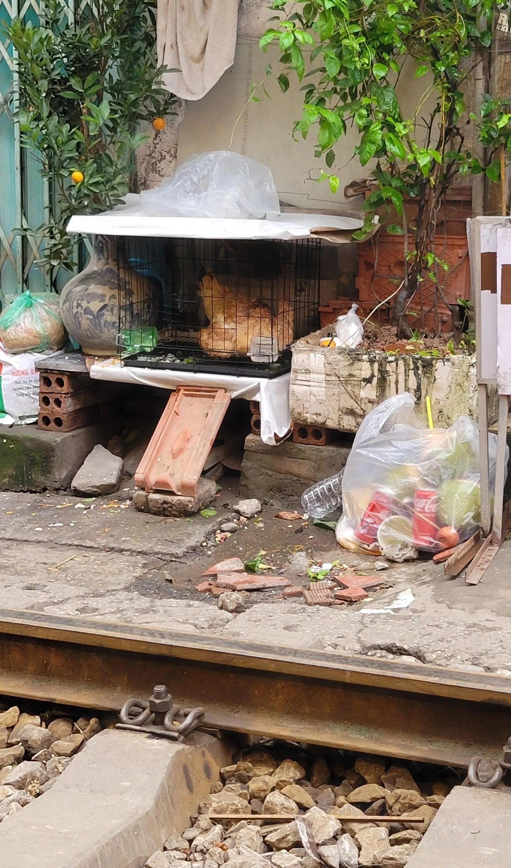 What is also uniquie about this, these little shops and restaurants are people’s homes. So it is not uncommon to see things you would see in a neighborhood. Look closely and you will see the family chicken in the cage, just three feet from the tracks. It was wild!!